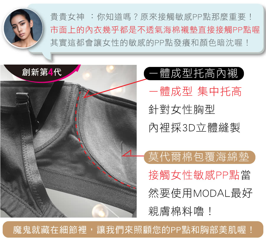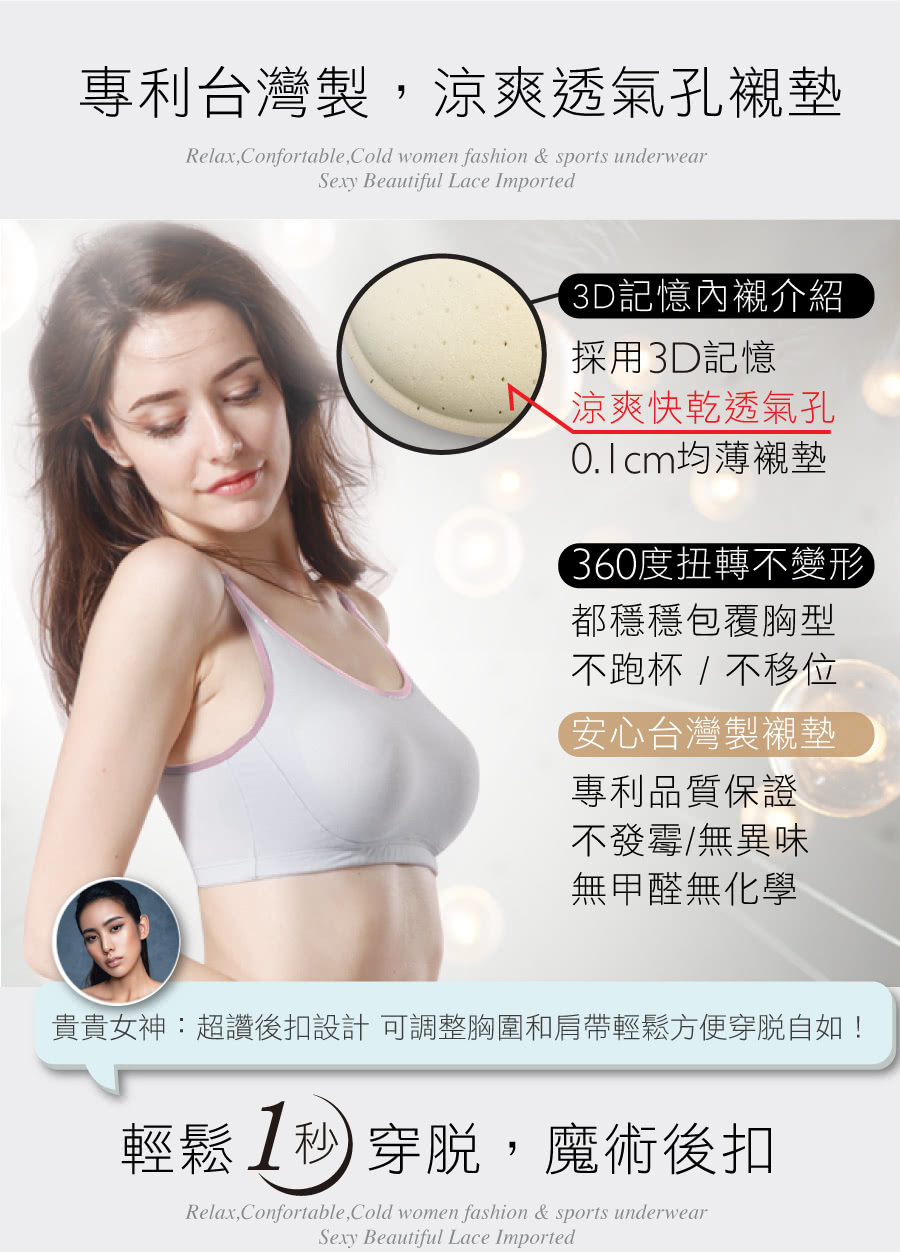 無鋼圈、零束縛,可依胸型調整背扣,肩帶,從此無需再穿堅硬鋼圈胸圍,加強血液循環,令乳房更健康立體